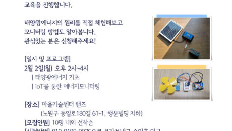 새해 복많이 받으세요! 2026년 첫 핸즈데이를 2월에 진행합니다. 이번에는 <태양광에너지 기초와 모니터링>을 주제로 교육을 진행합니다. 태양광에너지의 원리를 직접 체험해보고 모니터링 방법도 알아봅니다. 관심있는 분은 신청해주세요! [일시 및 프로그램] 2월 2일(월) 오후 2시~4시 | 태양광에너지 기초 | IoT를 통한 에너지모니터링 [장소] 마을기술센터 핸즈 (노원구 동일로180길 61-1, 행운빌딩 지하) [모집인원] 10명 내외 선착순 [신청방법] 010-8188-9076으로 문자보내고…
