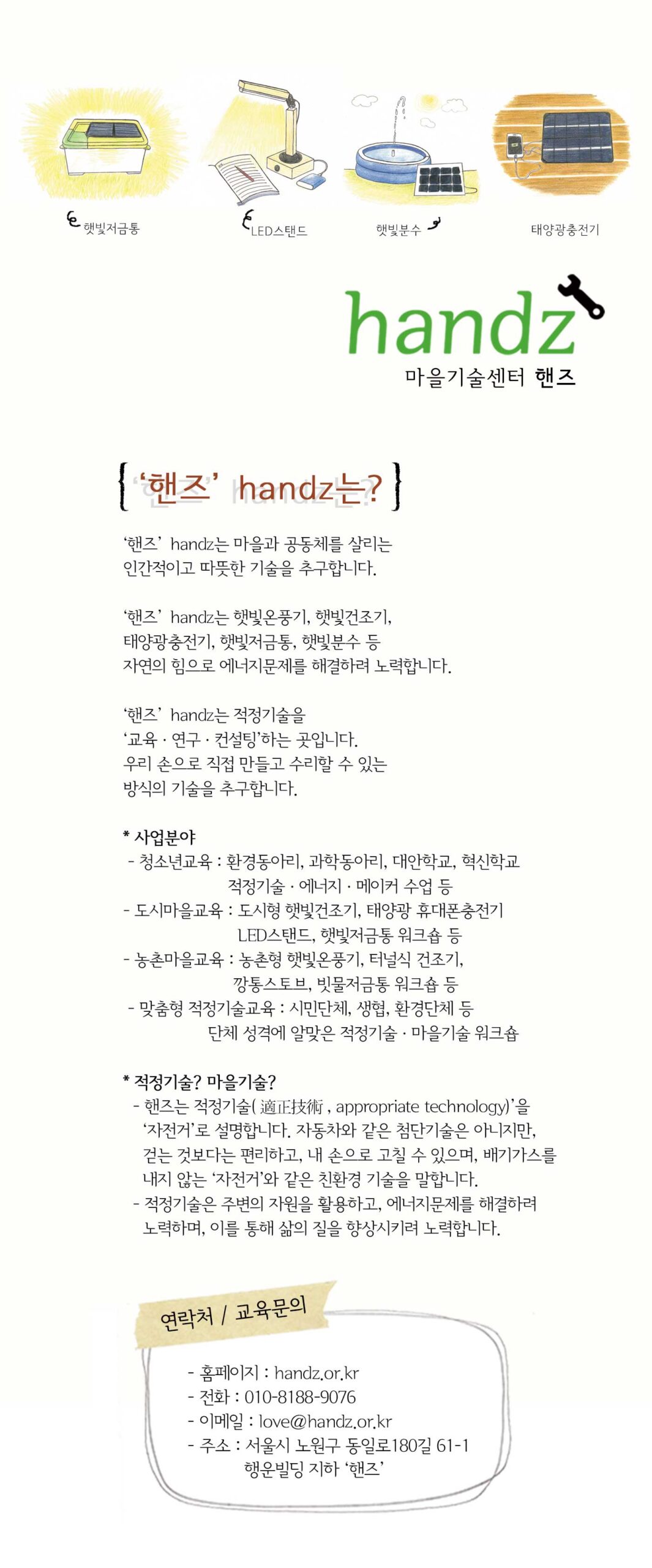 이제 핸즈는 적정기술 교육기업으로 7년차를 보내며 지속가능한 ‘사업목표와 비전’을 어떻게 세울지, 반복적인 교육패턴의 매너리즘을 어떻게 극복할지를 고민하고 있다. 결국 핸즈는 적정기술을 통해 이 사회의 여러 요소들(특히 에너지)이 어떻게 연결되어 있고, 누가 이런 문제들을 책임져야 하는지를 잘 이해하도록 돕는 것이 목표이다. 그래서 우리 생활에 필요한 기술을 내 손으로 직접 구현해보고 싶어하는 사람들과 함께 활동하고자 한다. ‘적정’기술의 ‘적정’은 ‘적당함, 알맞음’을 말한다. 그래서 핸즈는 우리에게 ‘적정’한 기술이 무엇이고, 어떤 모습일지에 대해 계속 질문해 나가려 한다.