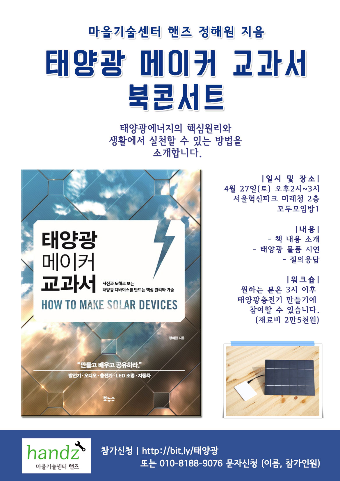 그래도 이 책을 통해 태양광에너지에 대해 많은 분들이 접할 수 있다면 좋겠네요. 책은 2주후쯤 나올 예정인데, 그 때에 맞춰 북콘서트를 엽니다. 책 내용 소개와 간단한 워크숍이 준비되어 있으니 관심있는 분은 신청해주세요. 참가비는 무료입니다.