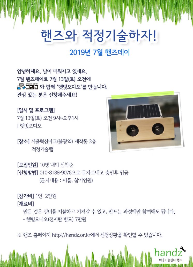7월 핸즈데이 : 햇빛오디오 [마감] handzat / 2019-06-24 안녕하세요. 7월 핸즈데이를 진행합니다. 요청이 있어 <햇빛오디오>를 만드니 관심있는 분은 신청해주세요! ************ <신청내역> 7월 11일 현재 [마감] – 박*엽 외 2명, 백*성 외 1명, 김*란, 고*영 외 1명