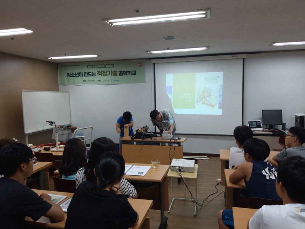 같은날 오후 해원샘은 동대문 휘경여중에서 중1학생들을 대상으로 적정기술에 대한 수업과 간단한 실습을 진행했습니다. 매년 휘경여중에 가는데 참 활기찬 친구들이라고 합니다.