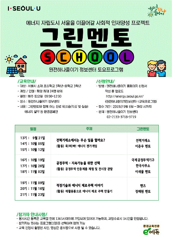 11월 9일, 16일, 23일에 학생들(초5학년~중3학년)을 대상으로 그린멘토스쿨을 진행합니다. 봉사시간도 인정되나 봅니다. 관심있는 분은 신청해주세요. 핸즈는 적정기술과 에너지제로주택 이야기를 전합니다.