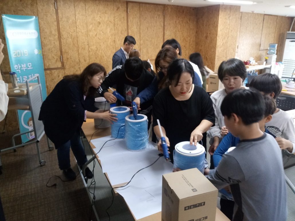 19일 해원샘은 인천진로교육센터에서 열린 학부모와 함께 하는 진로교육의 하나로 공기청정기 만들기 워크숍을 진행했습니다. 어린 학생들도 있고 시간도 길었는데, 학생들이 즐겁게 참여한 워크숍이었다고 합니다.