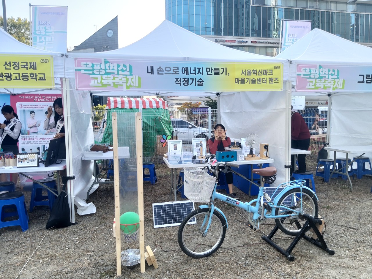 25일에는 구파발역 옆에서 열린 은평 혁신교육축제에 참여했습니다. 저랑 인턴이었던 지연이가 함께했는데요. 여기서 핸즈는 전시와 체험을 진행했습니다. 이번에는 새로운 아이템인 <자전거발전 풍선띄우기>를 선보였습니다! 자전거 발전기를 돌려서 생긴 에너지로 선풍기를 돌리는데, 풍선을 띄워 특정 선 안에 맞추는 미션이랄까..^^ 인기가 많았습니다. 사람도 많고, 혁신파크 아는 단체도 만나고 관심 있는 사람도 많아서 참 좋았습니다!