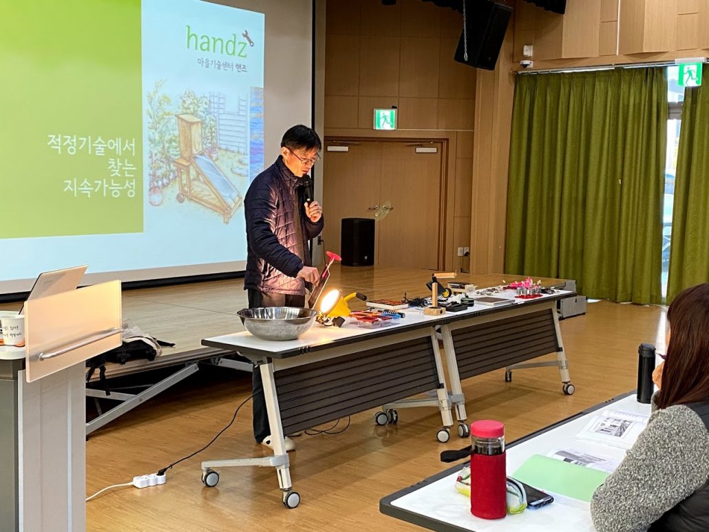 같은 날 해원샘은 버스를 타고 통영에 가서 ‘적정기술에서 찾는 지속가능성’이라는 제목으로 강의를 하고 왔습니다. 전시품과 간단한 체험거리를 배낭에 넣고 다녀왔고, 선생님들에게 에너지와 적정기술에 대한 이야기를 즐겁게 전하고 왔다고 합니다. 오가는 시간으로 하루를 다 보내기는 했습니다.