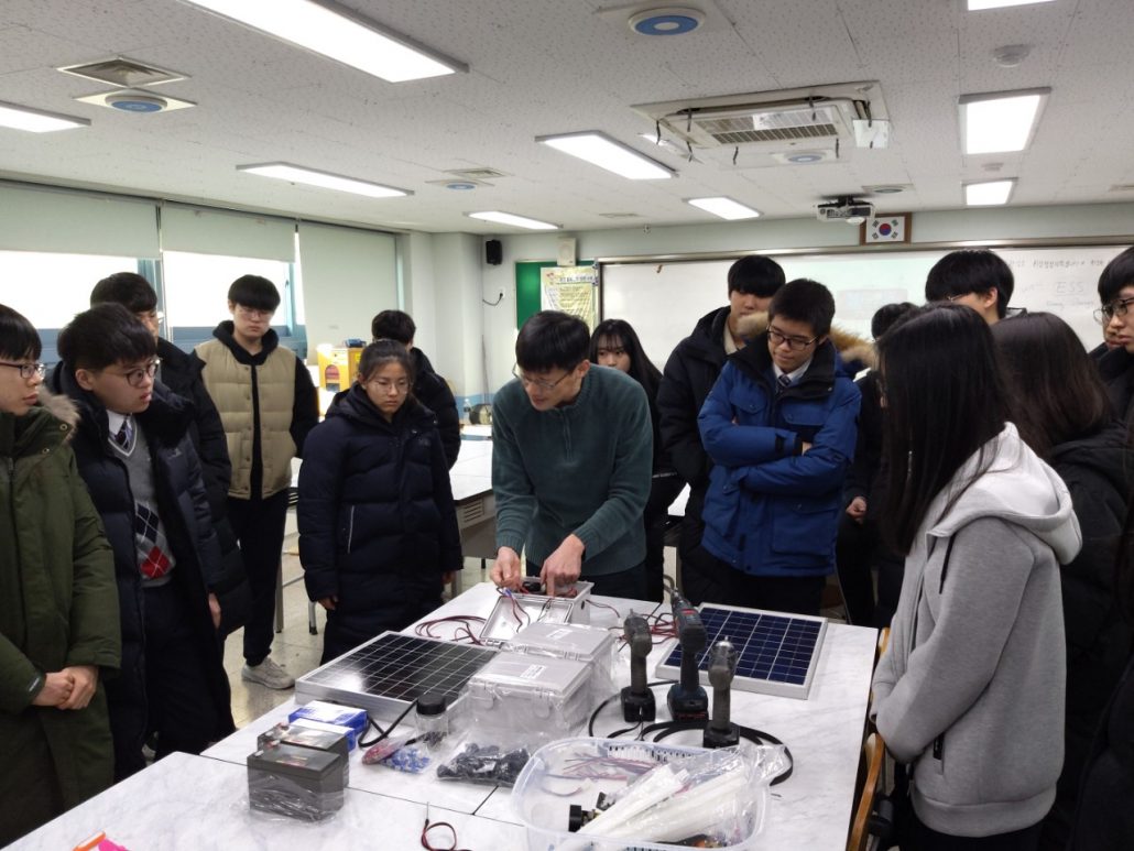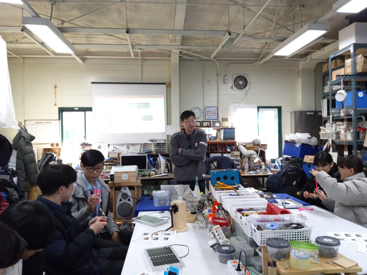 12월 26일, 27일은 구암고등학교에서 워크숍을 진행했습니다. 이틀 동안 태양광전지판, 햇빛저금통, 줄넘기발전기, 태양광자동차, 독립형태양광 등 여러 키트를 체험하고, 독립형태양광 충전기를 직접 만드는 실습도 진행했습니다. 적정기술 수업을 직접 선택한 친구들이라 집중도 잘 해주었고, 재미있고 유익한 질문들도 있었습니다. 둘째날에는 학생들이 주도해서 독립형태양광 장치를 만들었던 것도 기억에 남습니다.