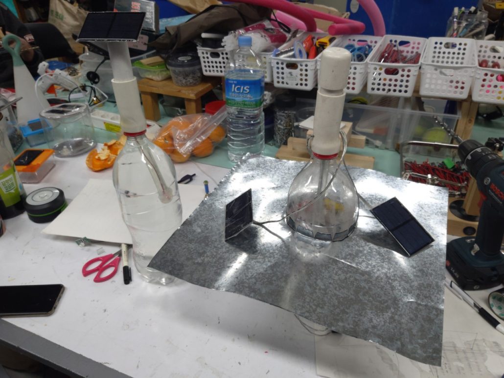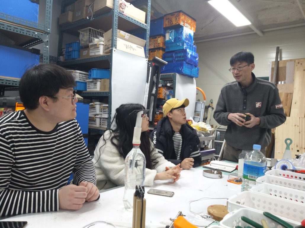 같은 날 오후에는 지난 11월 워크숍을 갔던 순천향대학교 학생분들이 찾아오셨습니다. 예전에 ‘친환경 컨베이어벨트’를 만들기로 했던 팀인데요. 이번에는 물병에 LED와 태양광전지판을 달아서 보다 더 효율 좋은 라이트를 만들고 싶어서 찾아왔다고 합니다! 이곳저곳 모두 함께 재료를 찾아 만들었는데요. 정말 재미있는 분들이셔서 계속 웃으면서 작업했네요. 프로젝트 꼭 성공하시길! 같은 시간 미국에서 오신 발명가선생님은 추적장치를 열심히 만들기도 했습니다.