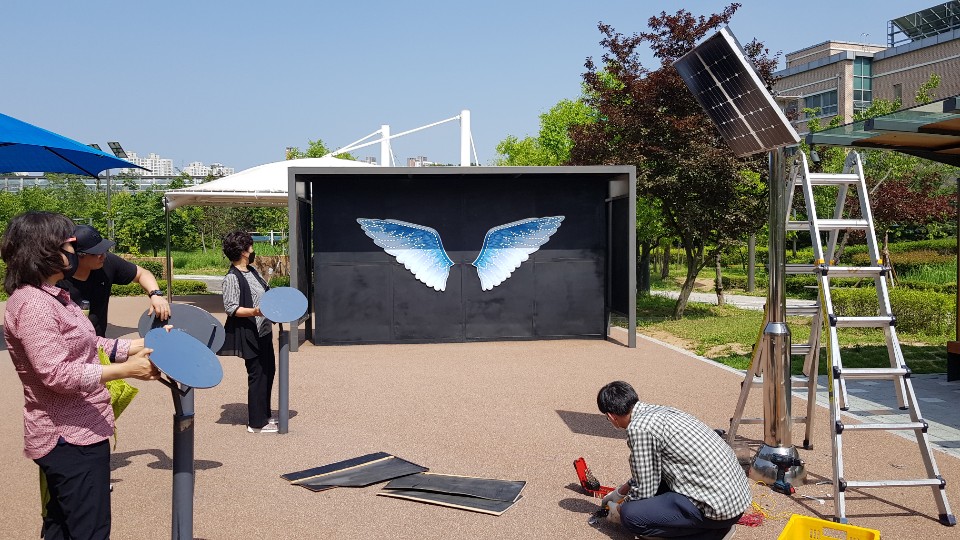 그리고 첫 주에는 태양광을 반사시켜 불이 켜는 천사날개를, 10일에는 뺑뺑이 놀이기구인 회전무대를 수리했습니다. 뺑뺑이를 돌리면 음악이 나오는 구조인데, 고장난 부분을 찾아 고쳤습니다. 이렇게 핸즈는 재생에너지 기구 수리도 잘 합니다.^^