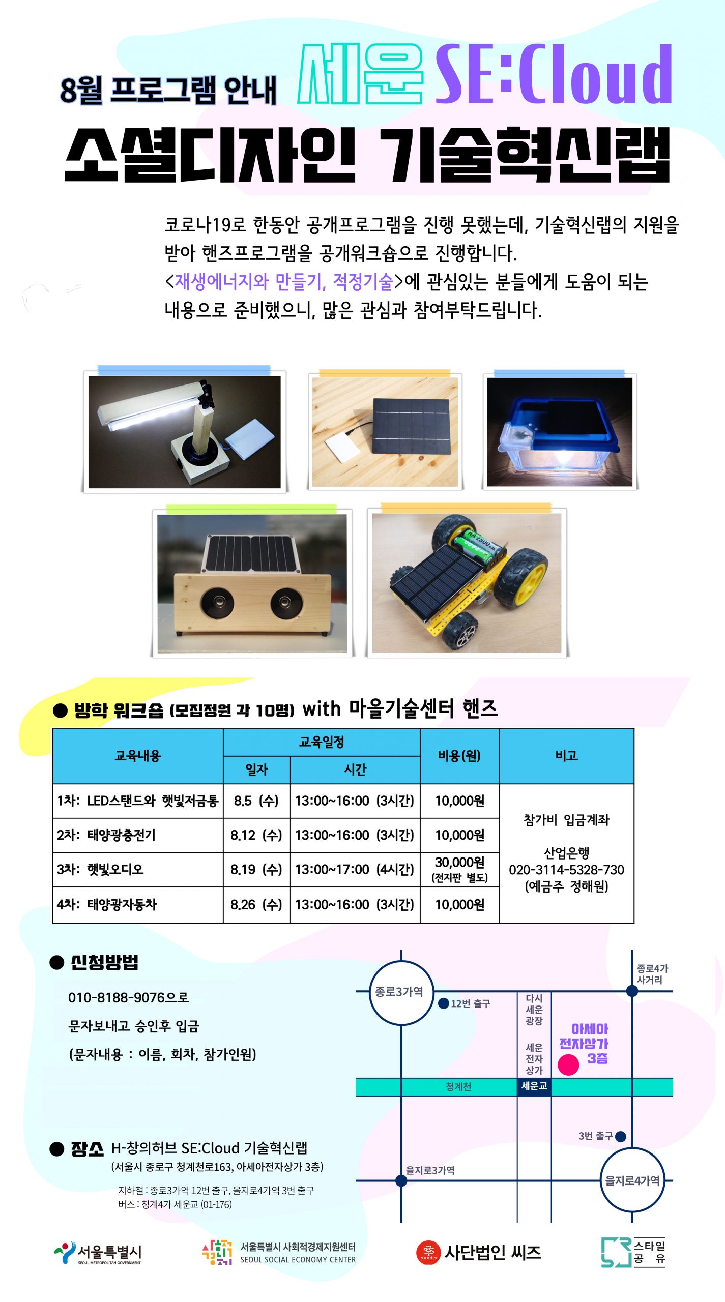 안녕하세요. 8월에는 <세운상가 기술혁신랩>과 방학프로그램을 진행합니다.
