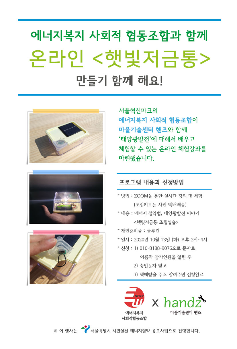 안녕하세요. 서울혁신파크의 에너지복지사회적협동조합과 함께 태양광교육을 온라인으로 진행합니다. 햇빛저금통도 키트를 보내드리고 줌(ZOOM)을 통해 함께 만드는 과정을 무료로 함께 할 수 있습니다. 관심있는 분은 신청해주세요. 10월 13일 오후 2시부터 진행합니다.