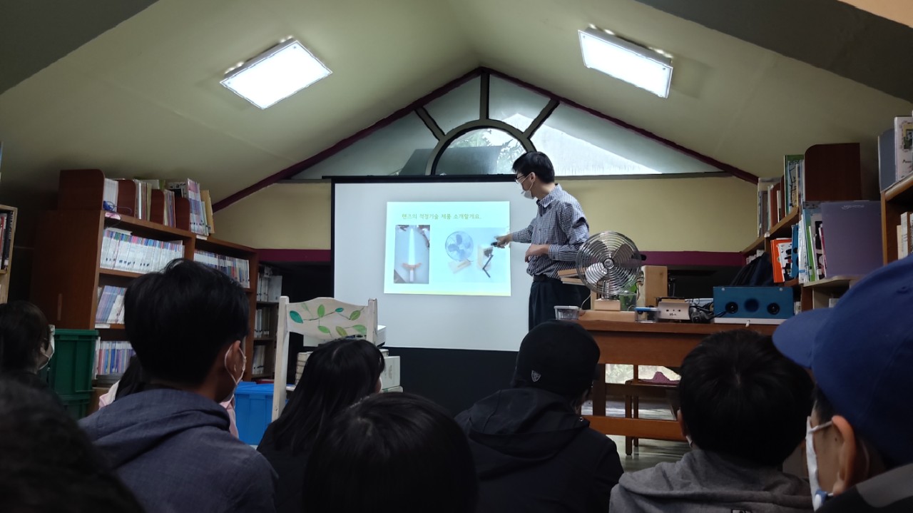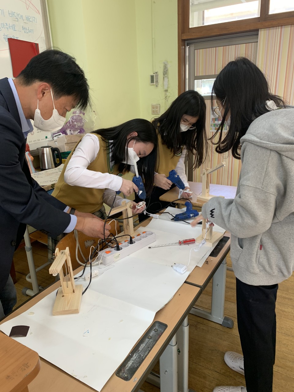 20일 오후 핸즈는 윤중중학교에서 1, 2학년 친구들과 함께 LED스탠드와 햇빛저금통을 만들었고, 적정기술을 체험하는 수업도 동시에 진행했습니다. 두 팀으로 나눠 강의파트와 만들기 파트를 번갈아가며 진행했는데요. 대답도 시원시원하게 잘 하고 밝은 친구들이라 저 역시 재미있게 진행할 수 있었습니다! 재미있는 친구들이었죠. 온라인으로 만나던 친구들을 직접 만날 수 있어 좋았습니다.