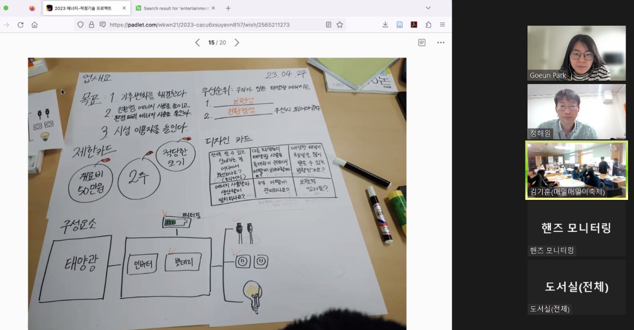 작년에 이어 올해도 추풍령중학교 학생들과 적정기술 프로젝트를 진행합니다. 핀란드의 박고은샘이 역시 함께 해줍니다. 4월 17일에는 대면수업으로 진행을 했고, 24일에는 온라인으로 코디자인에 대해서 배우는 시간을 가져습니다. 이제 아이디어를 정리해서 5월에는 직접 학교에 필요한 것들을 만드는 과정으로 진행합니다. 시간이 짧아서 약간 마음이 급하기는 하네요.