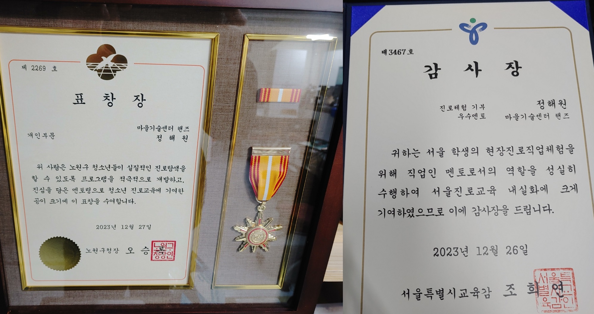 노원구 표창장(청소년 진로교육), 서울교육청 감사장(진로체험 멘토) 수상