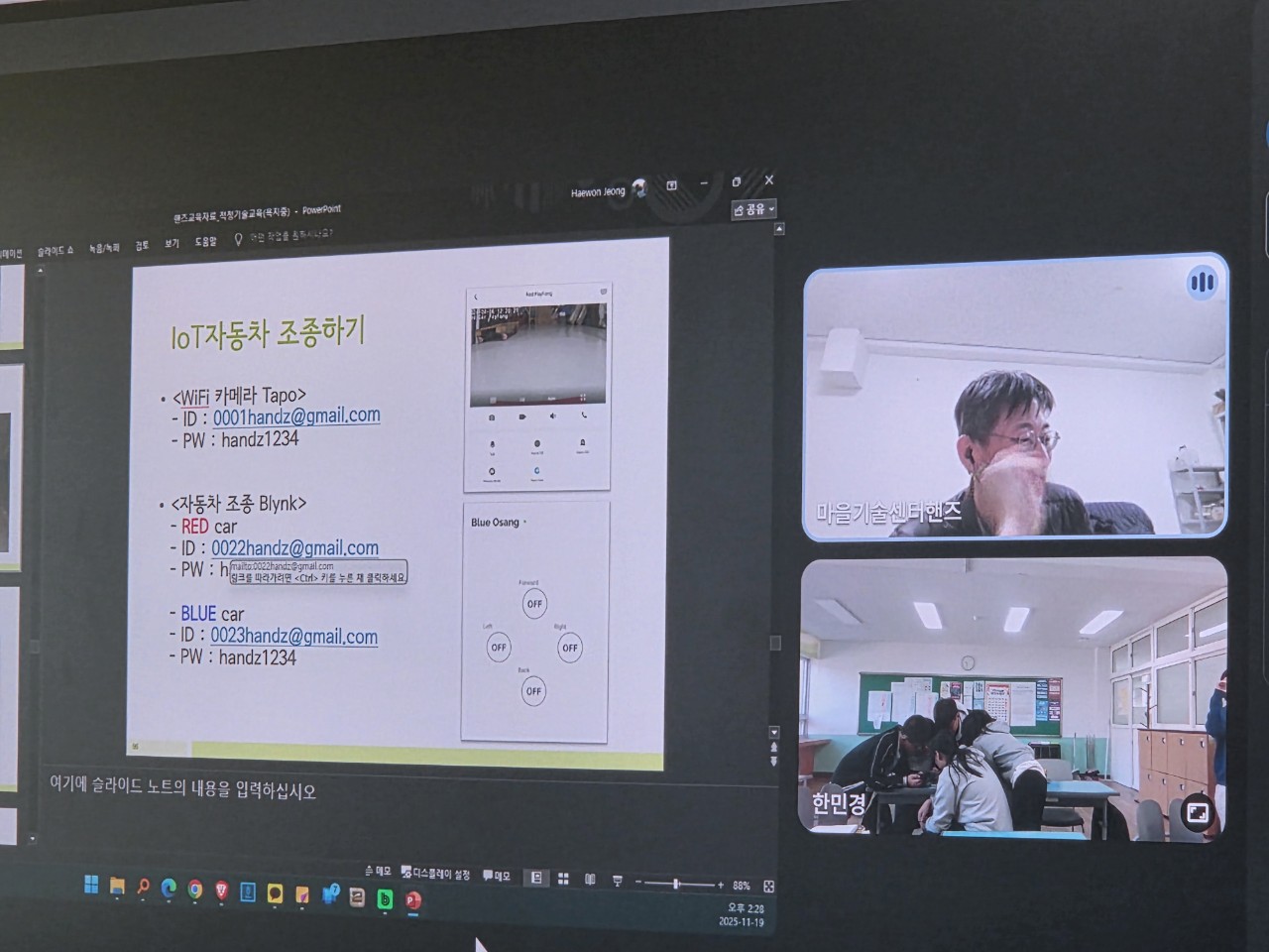 19일에는 통영 욕지도에 있는 욕지중학교 학생들에게 온라인으로 ‘적정기술’을 소개하는 시간을 가졌습니다. 5명의 학생을 온라인으로 만났고, 온라인이라는 한계가 있었지만 다양한 시연을 보여주려고 했습니다. IoT를 통해 학생들이 핸즈에 있는 장치는 작동시키고, IoT 태양광자동차를 카메라로 확인하며 조종하며 즐겁게 진행할 수 있었습니다.