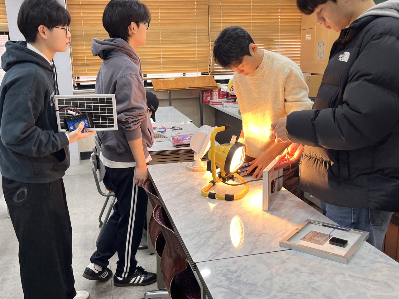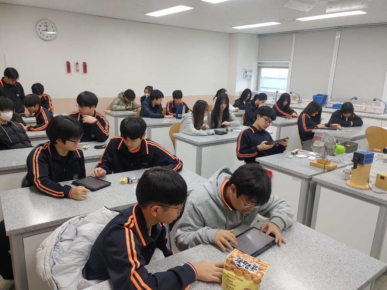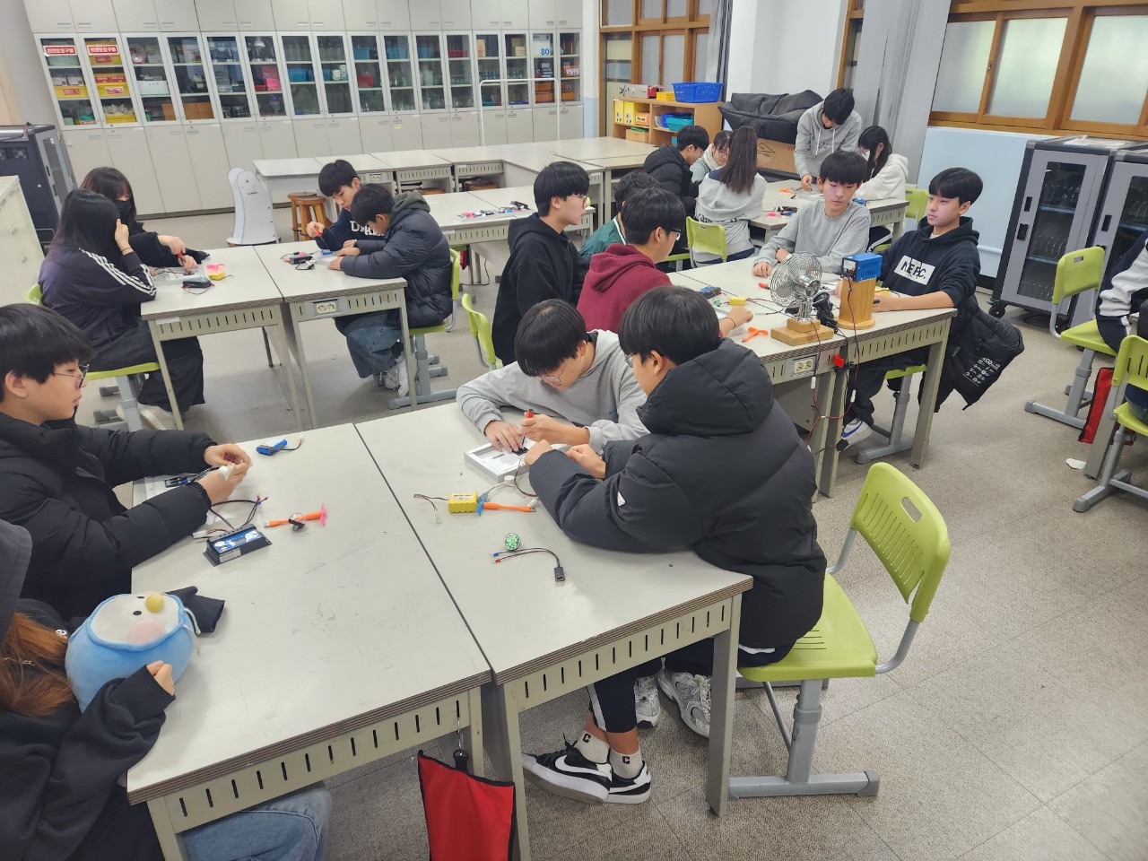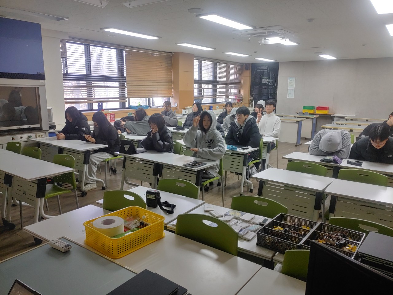 24일에 저는 범준샘, 선영샘과 함께 건대부고에서 생태전환교실을 진행했습니다. 태양광실습과 아두이노 실습을 범준샘이 진행했고, 저는 인간동력발전과 IoT실습을 진행했답니다. 수업을 마치고 점심도 맛있게 먹을 수 있었네요.