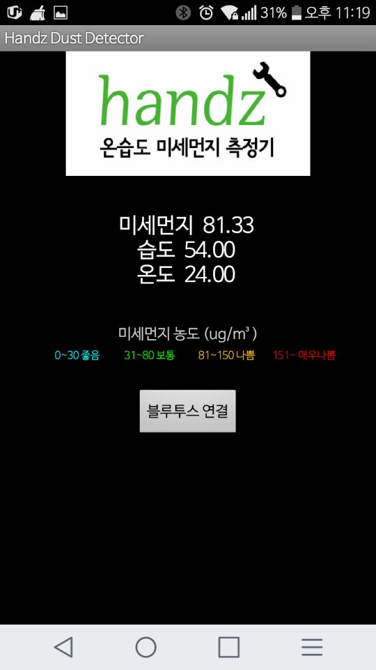 핸즈자료실 제목미세먼지 측정기 자료2018-04-17 12:51작성자handzat 첨부파일dust_handz0508.zip (0.9KB)handzdust_aia.zip (27.2KB)1. 어플리케이션핸즈의 미세먼지측정기 어플리케이션입니다.앱 인벤터로 만들었습니다.여기에서 다운받으세요.https://handz.or.kr/handz_dustapp.apk2. 아두이노 소스코드는 첨부화일을 다운받아 업로드하면 됩니다.지금은 소스 중간의 calibration에 보정에 필요한 숫자를 넣어서 보정을 하고 있습니다.3. 실제 작동시 아두이노의 리셋버튼을 한번 눌러줘야 합니다. 그래야 블루투스가 잘 작동을 합니다.4. 두번째 첨부화일(aia)은 앱인버터 파일로 이 파일을 가져다가 수정하면 자신이 원하는 어플리케이션을 만들 수 있습니다. http://appinventor.mit.edu/ 앱인벤터는 이 사이트에서 이용할 수 있습니다. 목록답변 이전성대골 미니태양광 리빙랩 시민가이드북handzat 2017-10-29다음태양광 무선조종 자동차 도면 (블루투스+아두이노) 2024handzat 2019-03-14 핸즈에 질문하세요!이 양식을 작성하려면 브라우저에서 JavaScript를 활성화하십시오.이름 *Email *전화번호 *질문하고 싶은 내용을 적어주세요 *개인정보 수집동의 *동의합니다.동의하지 않습니다.Submit Powered by MangBoard | 망보드 스토어