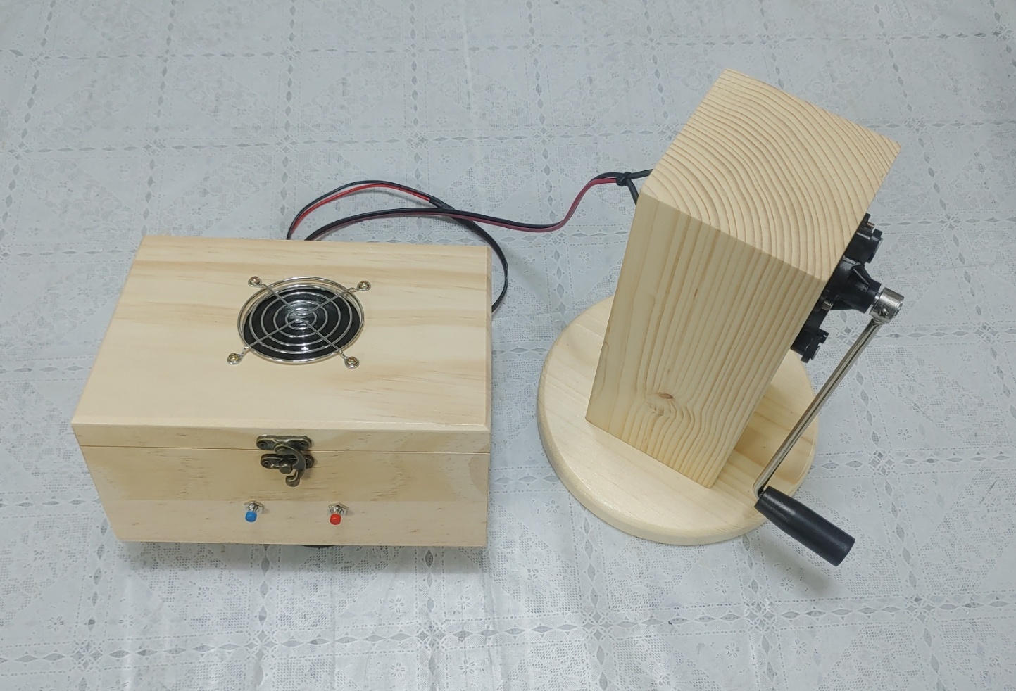 | 8. 손발전기와 선풍기 손으로 핸들을 돌려 전기에너지를 만들 수 있습니다. 이 전기로 선풍기가 돌아갑니다. 회전운동을 통해 에너지가 만들어지는 과정을 바로 확인할 수 있습니다. [실재료비 12만원 / 완제품 16만원] |